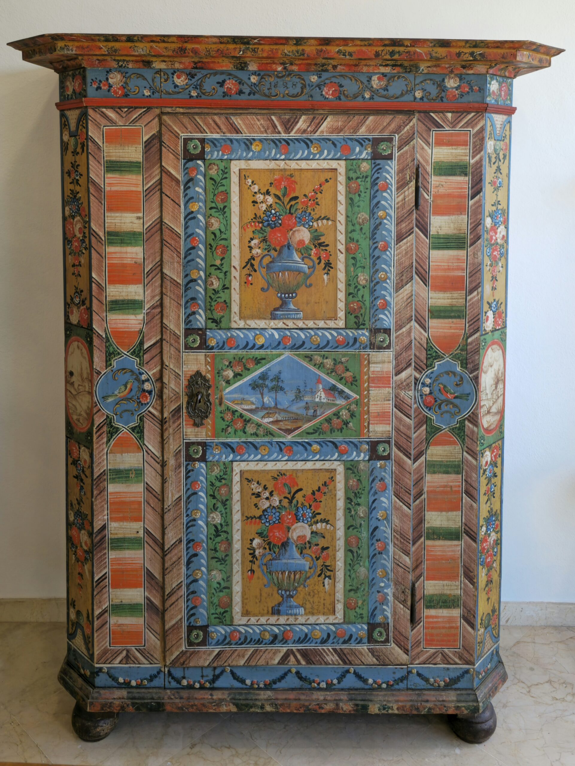 Decoración con ramos de flores, pájaros y escenas de la vida rural